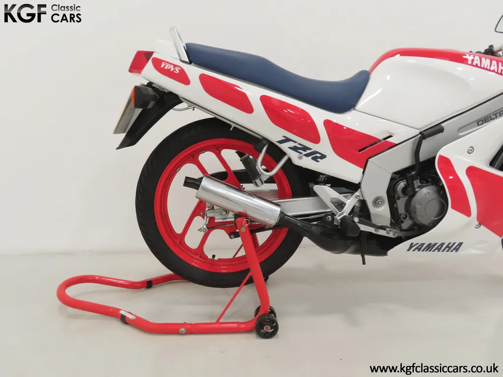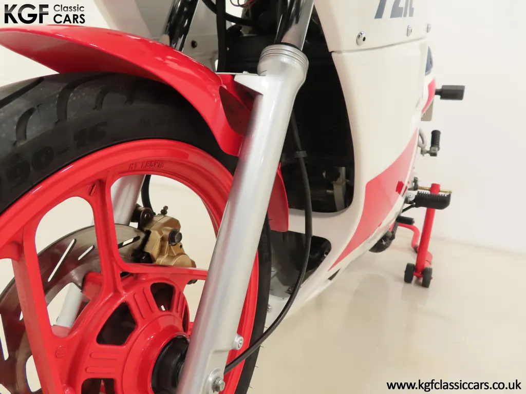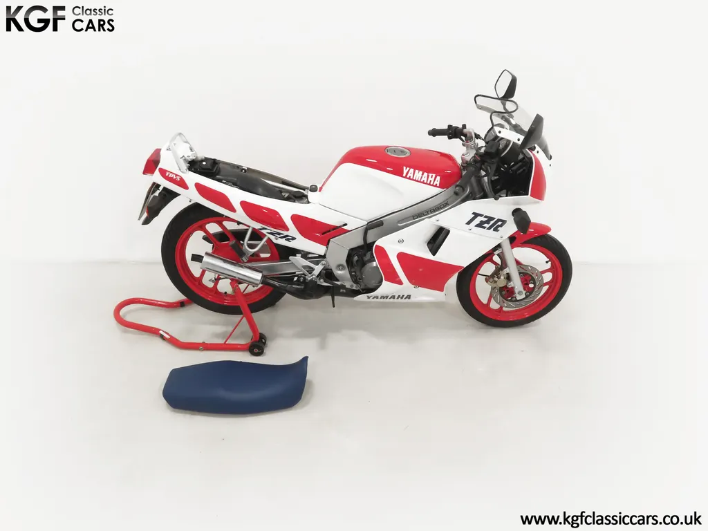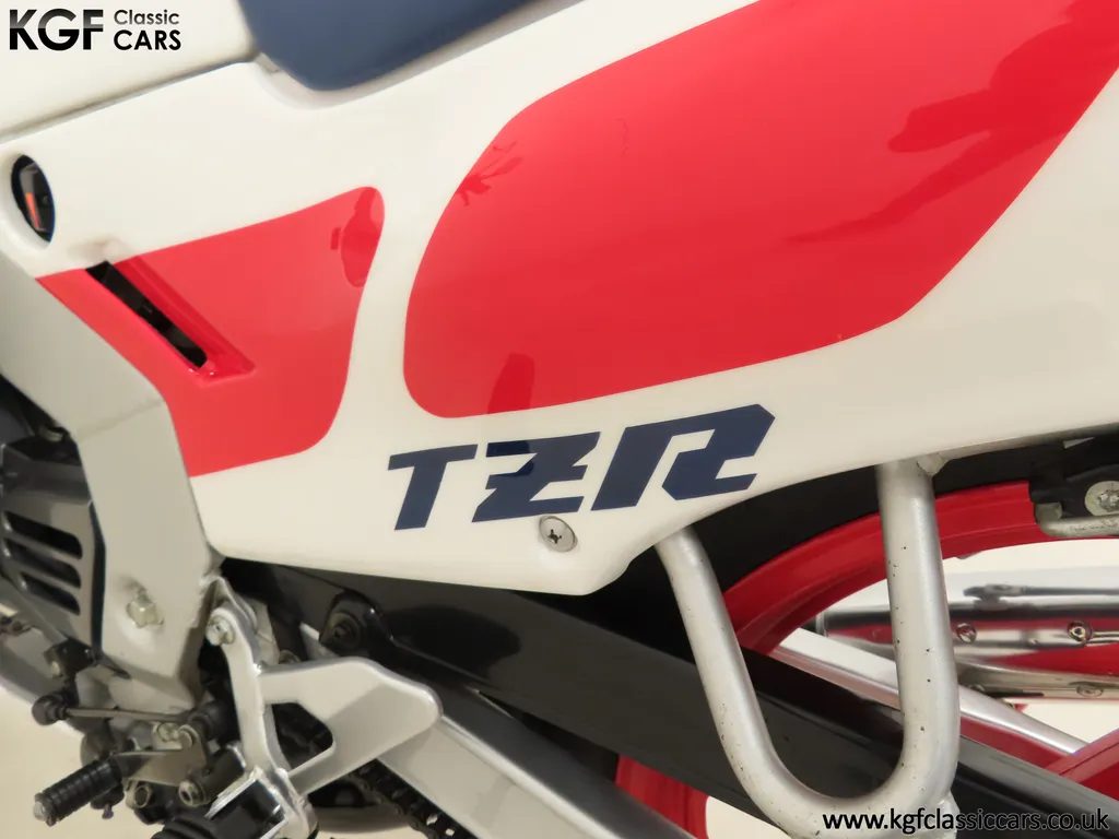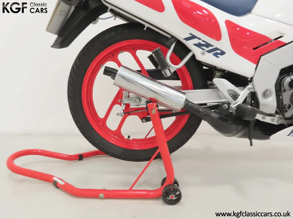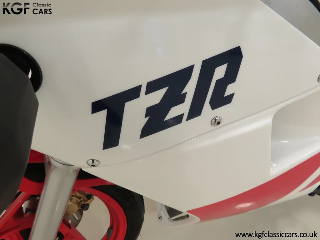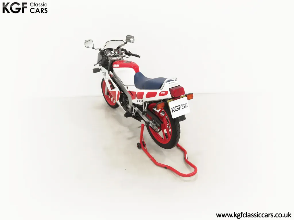FOR SALE A matching numbers Yamaha TZR125 presented in collector quality condition. EQUIPMENT DELTABOX frame fabricated from high-quality steel pressings, Monocross suspension with box-section high-tensile steel swinging arm, De Carbon-type shock absorber, racer-style clip-on handlebars, rectangular headlight, windscreen, twin rear view mirrors, 12 litre fuel tank with flush-fitting aircraft-type cap, square tube passenger grab rail, cast alloy triple-spoke wheels, YEIS (Yamaha Energy Induction System) boost chamber, YPVS (Yamaha Power Valve System), liquid cooling, speedometer, tachometer, water temperature gauge, ignition switch incorporating park light, turn signal switch, headlight switch, neutral indicator, horn, steering lock, rear footrests, locking helmet holder. Factory Options: Full fairing kit. EXTERIOR Following on from the traditions of Yamaha’s famous RD models but taking on groundbreaking technology, the TZR125 was yet another world-beating supersports lightweight machine. This exceptional specimen is finished in the red and white colour scheme that the bike and the optional full fairing was made with. Many components of this example are unrestored with the exception of the stunning paintwork to the tank and fairings that was entrusted to renowned Pauls Custom Paintwork of West Kingsdown who specialises in ‘all paint no stickers’ finishing. The white is done in Pearl finish so, at a glance, it appears standard but in sunlight it looks amazing with a pearl fleck. Originality is seen extensively with the original olive drab green finish to fittings as well as factory switchgear, hand grips and foot peg rubbers. The windscreen shows some faint stress crazing to the top section. Light patina to the unrestored components is fully acceptable and the bike showcases the perfect mix of pleasing originality and flawless paintwork. The seat is professionally retrimmed in the correct blue covering, underneath which is the original Yamaha toolkit. This is a very special bike. ENGINE & TRANSMISSION Powered by a liquid cooled 2 stroke motor, this TZR125 is basically half of Yamaha’s sensational TZR250 which is itself based directly on the World Championship-winning TZ road racers. Featuring the Mikuni VM26SS carburettor as well as technological advancements at the time such Yamaha Power Valve System, (YPVS) and Yamaha Energy Induction System, (YEIS). This being a French European model, it benefits from being unrestricted with full use of the fully operational YPV System. The engine number is stamped to the left side of the engine casing and matches that of the clearly visible frame stock stamp and VIN plate to confirm this as a matching numbers machine. The original Yamaha 2RL-14711 exhaust remains fitted. The 6-speed transmission is precise and the factory fitted strengthened clutch and wider final chain drive enables it to cope with the extra power. WHEELS, TYRES & BRAKES The cast alloy triple-spoke wheels retain the original unrestored red finish with prominent cast stampings and are shod in premium Michelin PilotStreet 80/90-16 front and 100/90-18 rear tyres. The TZR features a hydraulic disc front brake with slotted rotor to aid cooling and a correct gold finish opposed-piston caliper. The rear brake incorporates a weatherproof drum integral with the wheel. A great combination to generate maximum braking force. HISTORY FILE This amazing Yamaha TZR125 is a French European example that was brought into the UK in 2018 believed to be a one owner bike. The bike is UK registered on an age-related D prefix and fully roadworthy with valid MOT until May 2026. A Dating Certificate from Paul Dawkins, Motorcycle Historian and Dating Officer at the UK based Aircooled RD Club, confirms the bike was manufactured in June 1987 and that the colour and component specification is correct for the model year. Purchased and UK registered in 2019 and owned by the same collector ever since, the bike has been on display in his home showroom alongside many other 1980’s motorcycles, cars and retro memorabilia including an unused Sinclair C5! It has been well maintained with light regular use and performs fabulously, especially being an unrestricted full power YPVS model! The owner’s testimonial is also included with the history file. Supplied with its handbook, UK registration documents, previous MOT certificates and brochure, it is ready for the next appreciative enthusiast. MOT May 2026, HPI clear.