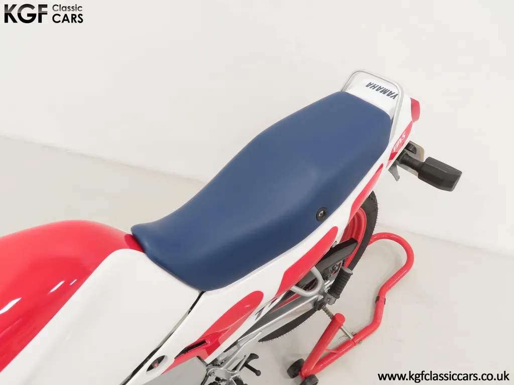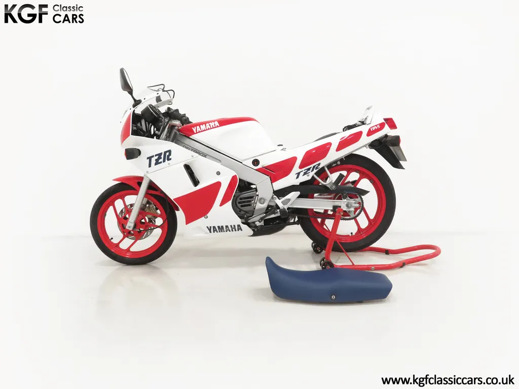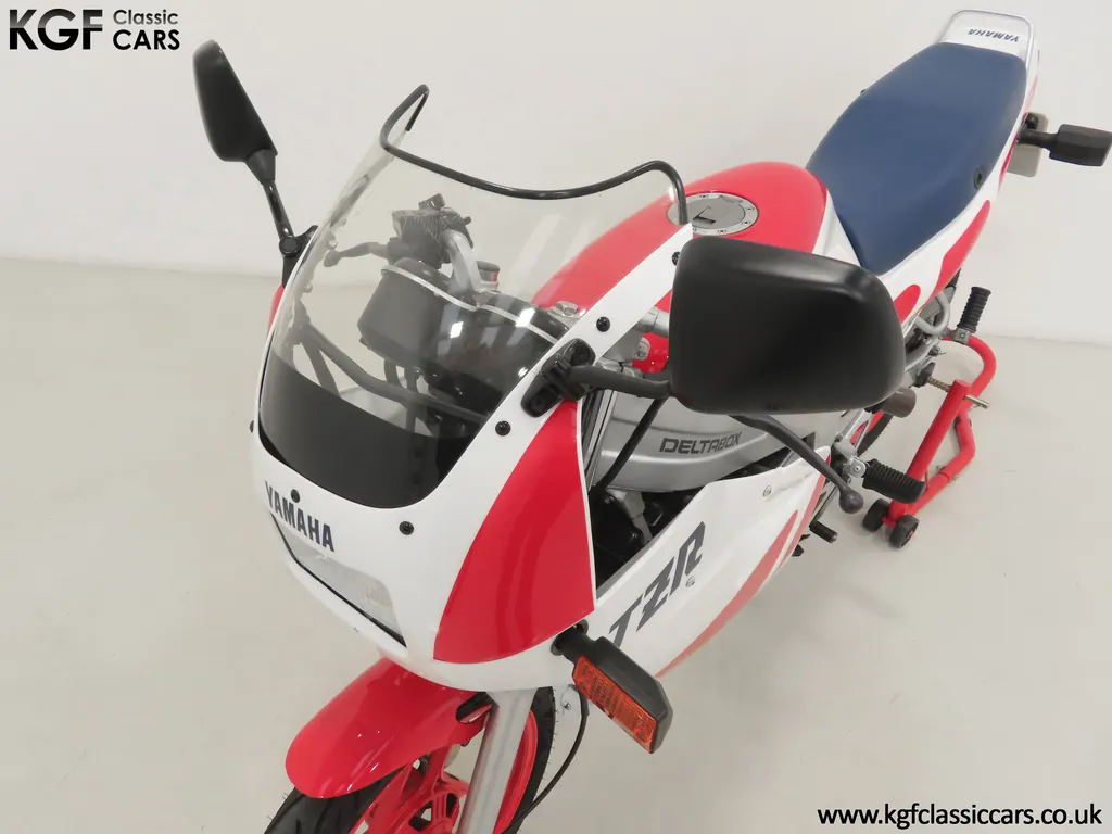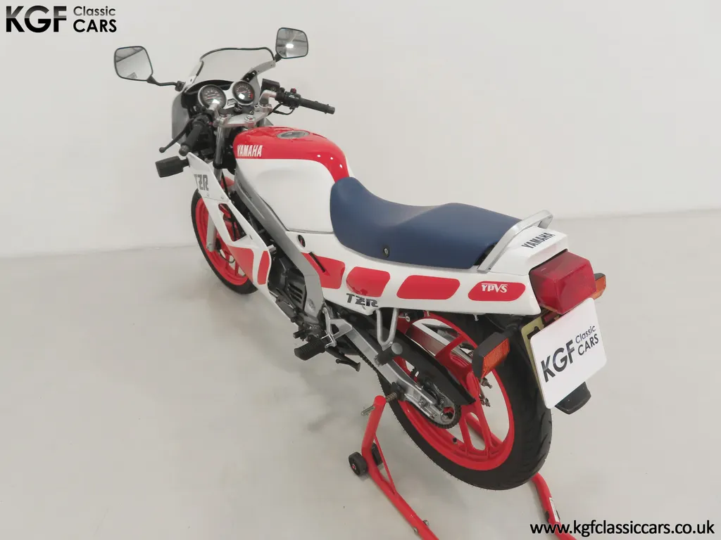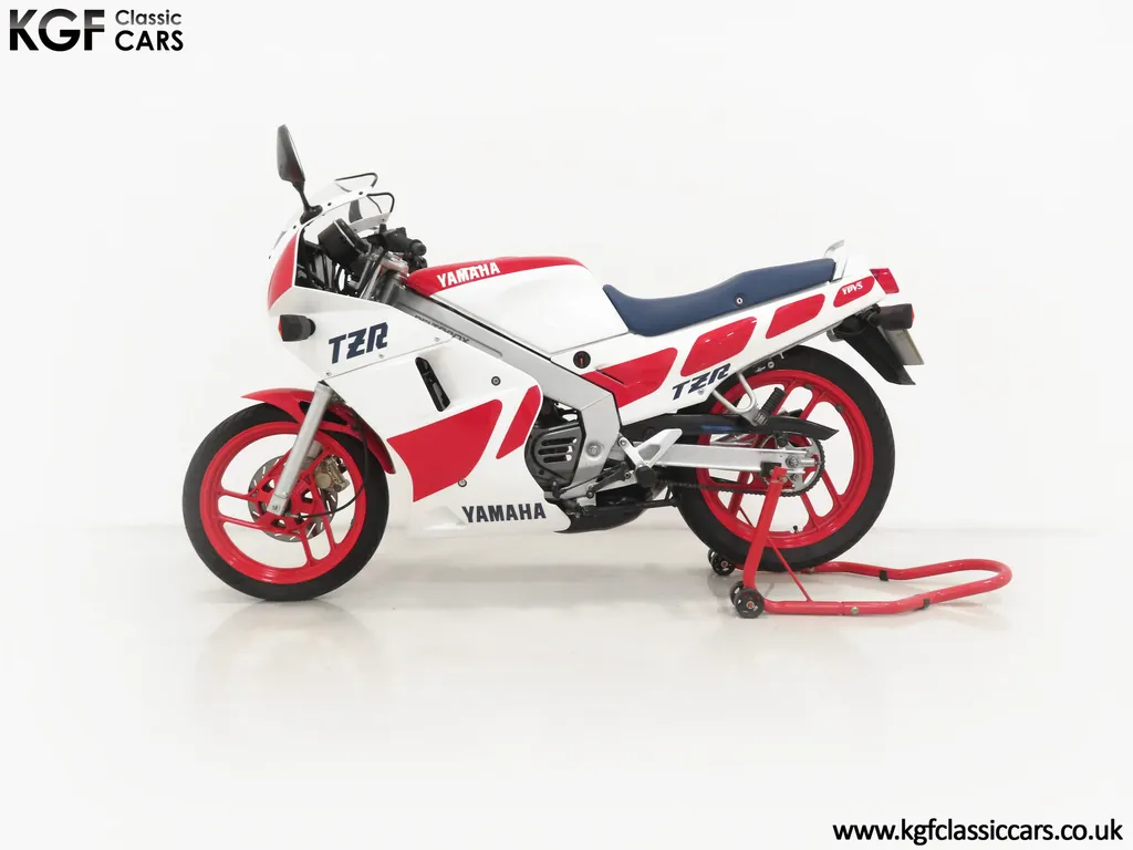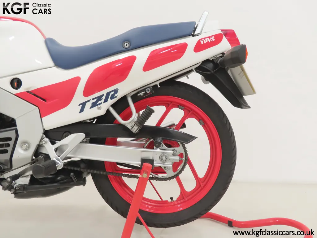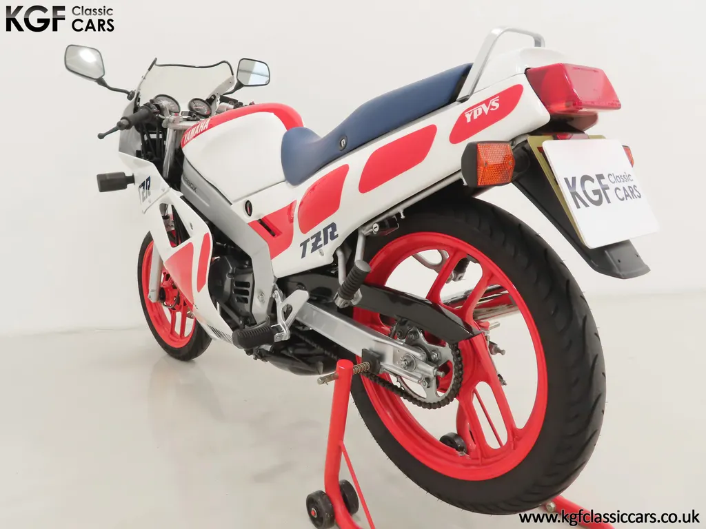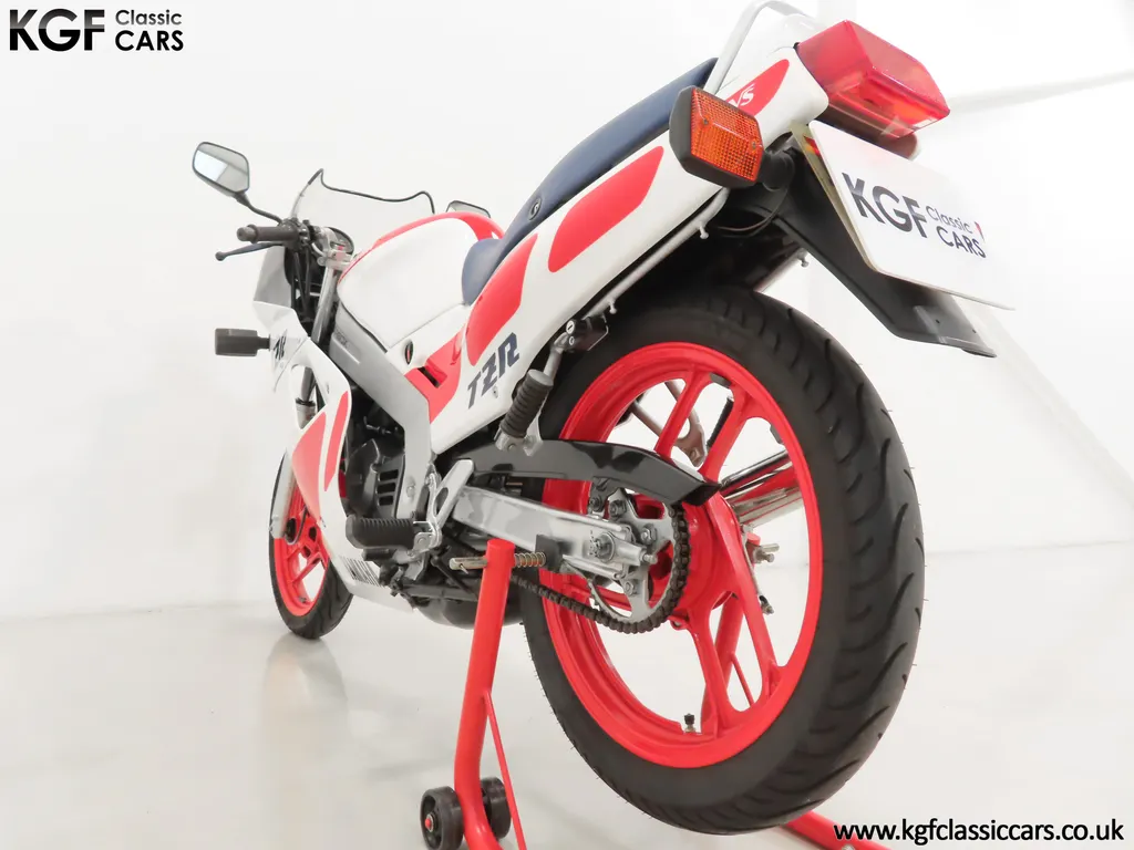 FOR SALE A matching numbers Yamaha TZR125 presented in collector quality condition. EQUIPMENT DELTABOX frame fabricated from high-quality steel pressings, Monocross suspension with box-section high-tensile steel swinging arm, De Carbon-type shock absorber, racer-style clip-on handlebars, rectangular headlight, windscreen, twin rear view mirrors, 12 litre fuel tank with flush-fitting aircraft-type cap, square tube passenger grab rail, cast alloy triple-spoke wheels, YEIS (Yamaha Energy Induction System) boost chamber, YPVS (Yamaha Power Valve System), liquid cooling, speedometer, tachometer, water temperature gauge, ignition switch incorporating park light, turn signal switch, headlight switch, neutral indicator, horn, steering lock, rear footrests, locking helmet holder. Factory Options: Full fairing kit. EXTERIOR Following on from the traditions of Yamaha’s famous RD models but taking on groundbreaking technology, the TZR125 was yet another world-beating supersports lightweight machine. This exceptional specimen is finished in the red and white colour scheme that the bike and the optional full fairing was made with. Many components of this example are unrestored with the exception of the stunning paintwork to the tank and fairings that was entrusted to renowned Pauls Custom Paintwork of West Kingsdown who specialises in ‘all paint no stickers’ finishing. The white is done in Pearl finish so, at a glance, it appears standard but in sunlight it looks amazing with a pearl fleck. Originality is seen extensively with the original olive drab green finish to fittings as well as factory switchgear, hand grips and foot peg rubbers. The windscreen shows some faint stress crazing to the top section. Light patina to the unrestored components is fully acceptable and the bike showcases the perfect mix of pleasing originality and flawless paintwork. The seat is professionally retrimmed in the correct blue covering, underneath which is the original Yamaha toolkit. This is a very special bike. ENGINE & TRANSMISSION Powered by a liquid cooled 2 stroke motor, this TZR125 is basically half of Yamaha’s sensational TZR250 which is itself based directly on the World Championship-winning TZ road racers. Featuring the Mikuni VM26SS carburettor as well as technological advancements at the time such Yamaha Power Valve System, (YPVS) and Yamaha Energy Induction System, (YEIS). This being a French European model, it benefits from being unrestricted with full use of the fully operational YPV System. The engine number is stamped to the left side of the engine casing and matches that of the clearly visible frame stock stamp and VIN plate to confirm this as a matching numbers machine. The original Yamaha 2RL-14711 exhaust remains fitted. The 6-speed transmission is precise and the factory fitted strengthened clutch and wider final chain drive enables it to cope with the extra power. WHEELS, TYRES & BRAKES The cast alloy triple-spoke wheels retain the original unrestored red finish with prominent cast stampings and are shod in premium Michelin PilotStreet 80/90-16 front and 100/90-18 rear tyres. The TZR features a hydraulic disc front brake with slotted rotor to aid cooling and a correct gold finish opposed-piston caliper. The rear brake incorporates a weatherproof drum integral with the wheel. A great combination to generate maximum braking force. HISTORY FILE This amazing Yamaha TZR125 is a French European example that was brought into the UK in 2018 believed to be a one owner bike. The bike is UK registered on an age-related D prefix and fully roadworthy with valid MOT until May 2026. A Dating Certificate from Paul Dawkins, Motorcycle Historian and Dating Officer at the UK based Aircooled RD Club, confirms the bike was manufactured in June 1987 and that the colour and component specification is correct for the model year. Purchased and UK registered in 2019 and owned by the same collector ever since, the bike has been on display in his home showroom alongside many other 1980’s motorcycles, cars and retro memorabilia including an unused Sinclair C5! It has been well maintained with light regular use and performs fabulously, especially being an unrestricted full power YPVS model! The owner’s testimonial is also included with the history file. Supplied with its handbook, UK registration documents, previous MOT certificates and brochure, it is ready for the next appreciative enthusiast. MOT May 2026, HPI clear.