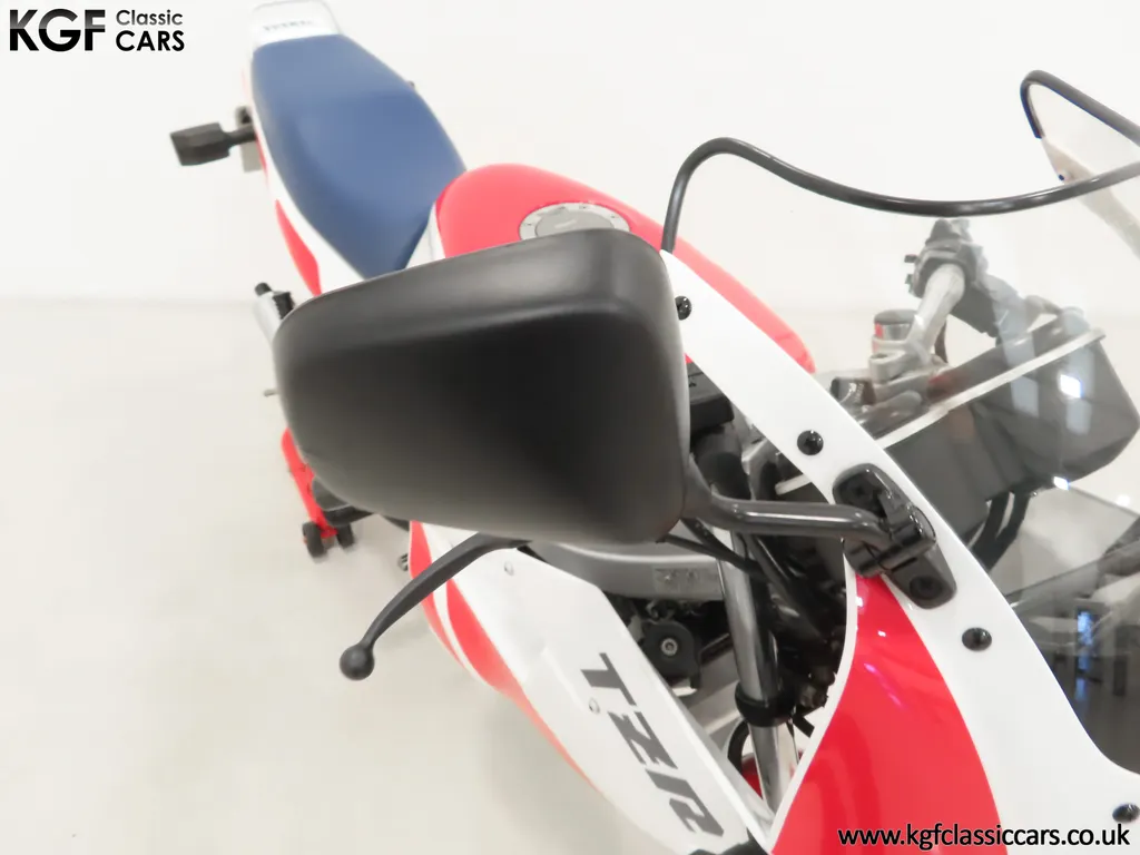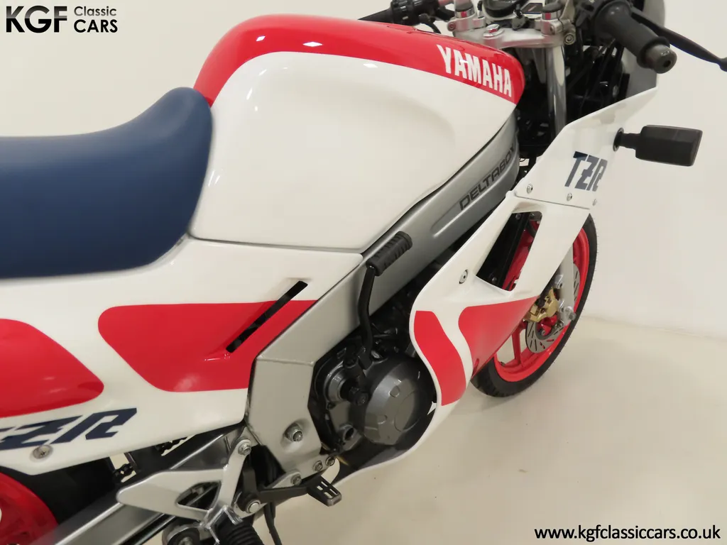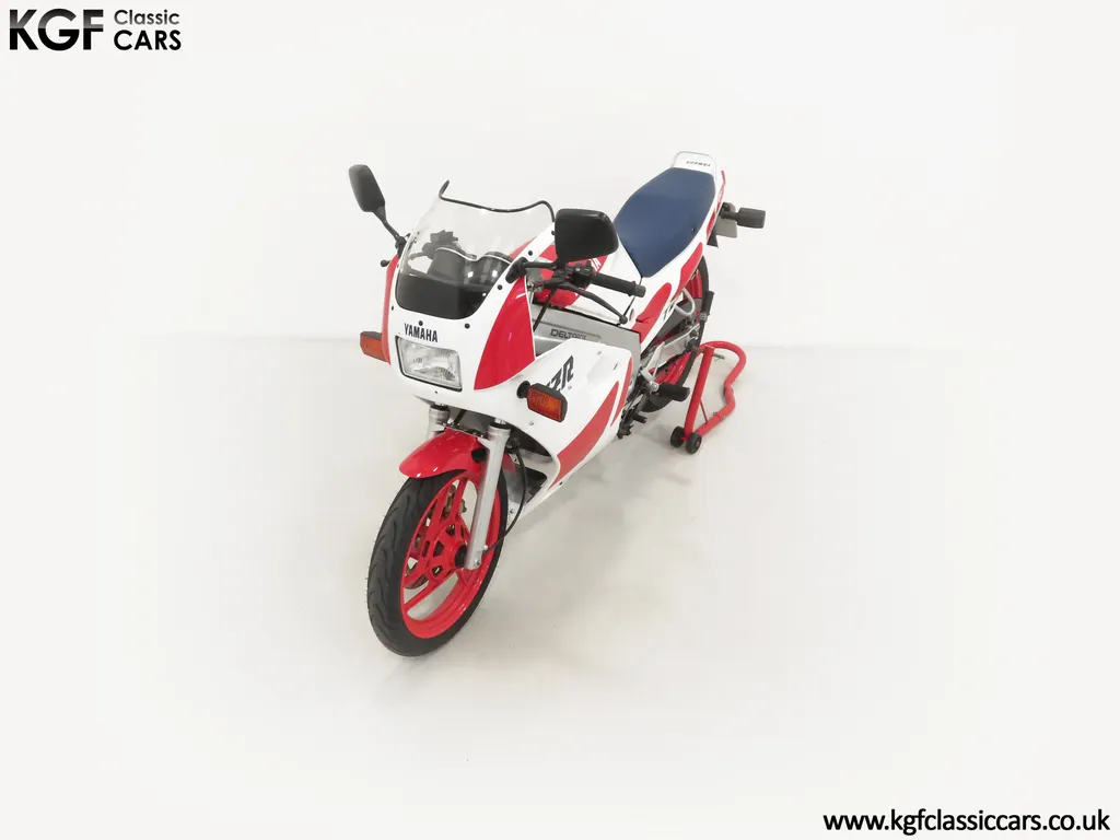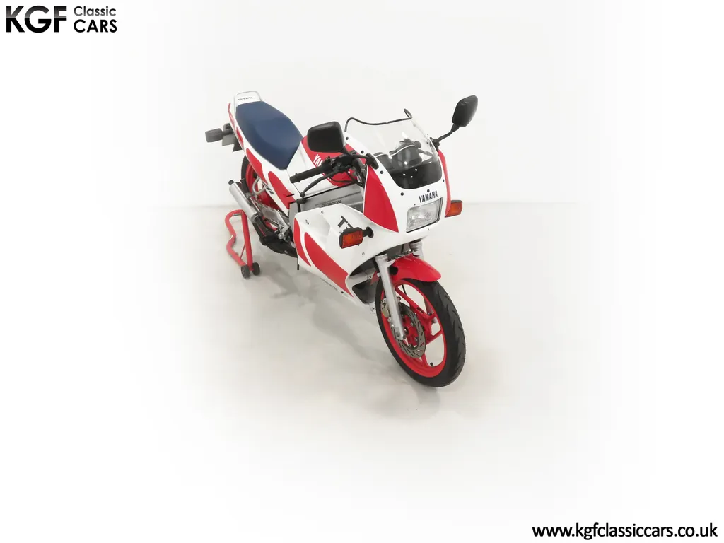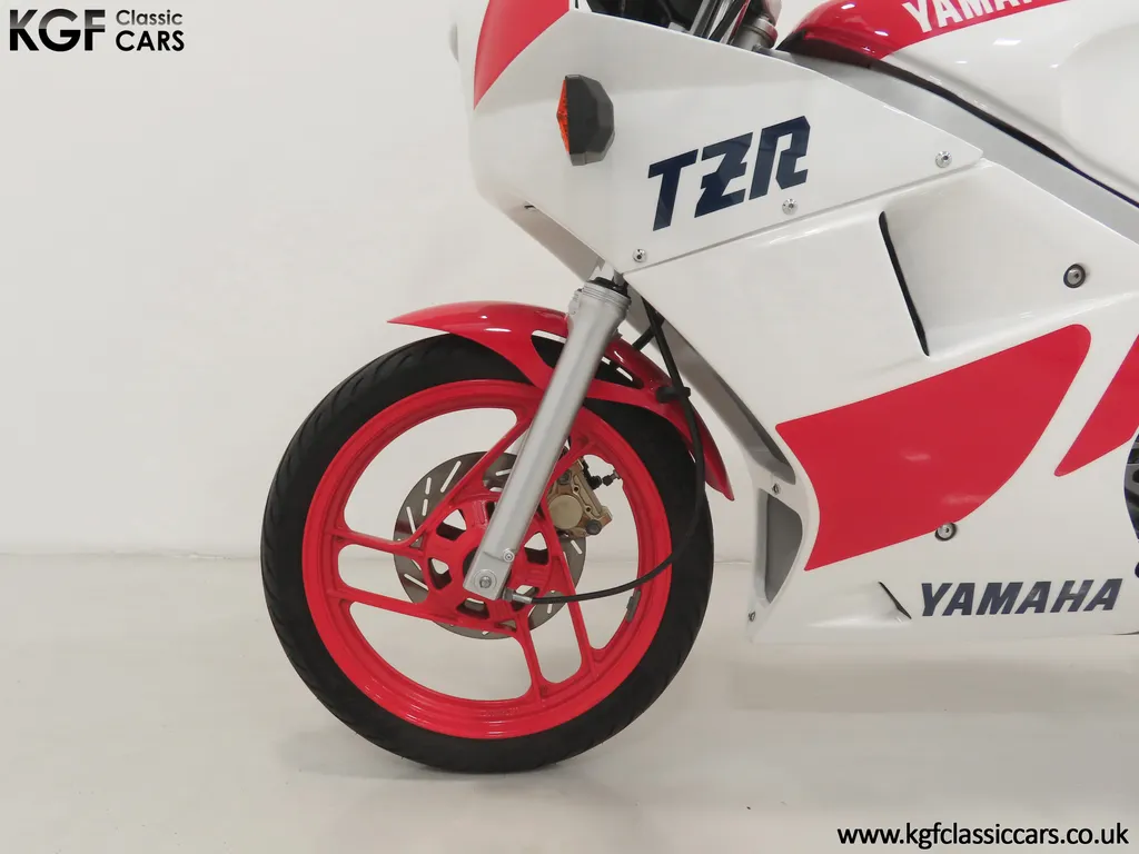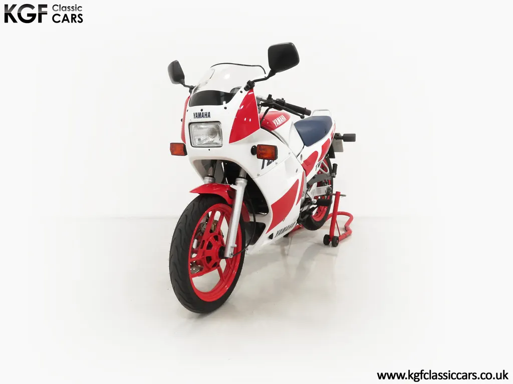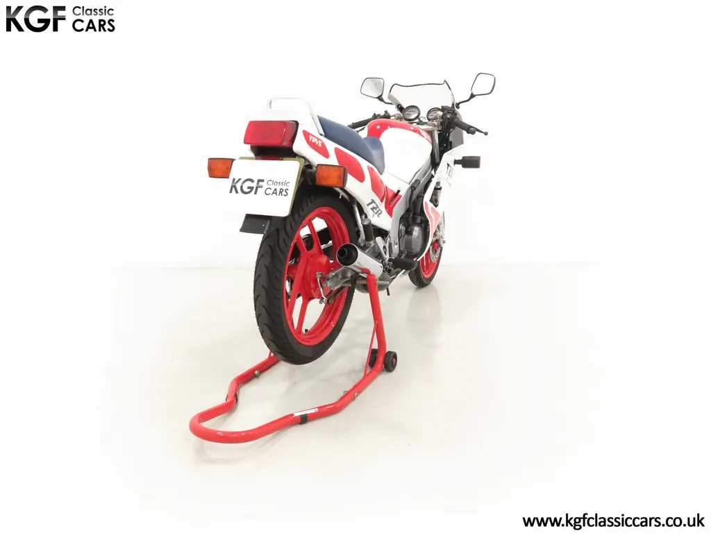 FOR SALE A matching numbers Yamaha TZR125 presented in collector quality condition. EQUIPMENT DELTABOX frame fabricated from high-quality steel pressings, Monocross suspension with box-section high-tensile steel swinging arm, De Carbon-type shock absorber, racer-style clip-on handlebars, rectangular headlight, windscreen, twin rear view mirrors, 12 litre fuel tank with flush-fitting aircraft-type cap, square tube passenger grab rail, cast alloy triple-spoke wheels, YEIS (Yamaha Energy Induction System) boost chamber, YPVS (Yamaha Power Valve System), liquid cooling, speedometer, tachometer, water temperature gauge, ignition switch incorporating park light, turn signal switch, headlight switch, neutral indicator, horn, steering lock, rear footrests, locking helmet holder. Factory Options: Full fairing kit. EXTERIOR Following on from the traditions of Yamaha’s famous RD models but taking on groundbreaking technology, the TZR125 was yet another world-beating supersports lightweight machine. This exceptional specimen is finished in the red and white colour scheme that the bike and the optional full fairing was made with. Many components of this example are unrestored with the exception of the stunning paintwork to the tank and fairings that was entrusted to renowned Pauls Custom Paintwork of West Kingsdown who specialises in ‘all paint no stickers’ finishing. The white is done in Pearl finish so, at a glance, it appears standard but in sunlight it looks amazing with a pearl fleck. Originality is seen extensively with the original olive drab green finish to fittings as well as factory switchgear, hand grips and foot peg rubbers. The windscreen shows some faint stress crazing to the top section. Light patina to the unrestored components is fully acceptable and the bike showcases the perfect mix of pleasing originality and flawless paintwork. The seat is professionally retrimmed in the correct blue covering, underneath which is the original Yamaha toolkit. This is a very special bike. ENGINE & TRANSMISSION Powered by a liquid cooled 2 stroke motor, this TZR125 is basically half of Yamaha’s sensational TZR250 which is itself based directly on the World Championship-winning TZ road racers. Featuring the Mikuni VM26SS carburettor as well as technological advancements at the time such Yamaha Power Valve System, (YPVS) and Yamaha Energy Induction System, (YEIS). This being a French European model, it benefits from being unrestricted with full use of the fully operational YPV System. The engine number is stamped to the left side of the engine casing and matches that of the clearly visible frame stock stamp and VIN plate to confirm this as a matching numbers machine. The original Yamaha 2RL-14711 exhaust remains fitted. The 6-speed transmission is precise and the factory fitted strengthened clutch and wider final chain drive enables it to cope with the extra power. WHEELS, TYRES & BRAKES The cast alloy triple-spoke wheels retain the original unrestored red finish with prominent cast stampings and are shod in premium Michelin PilotStreet 80/90-16 front and 100/90-18 rear tyres. The TZR features a hydraulic disc front brake with slotted rotor to aid cooling and a correct gold finish opposed-piston caliper. The rear brake incorporates a weatherproof drum integral with the wheel. A great combination to generate maximum braking force. HISTORY FILE This amazing Yamaha TZR125 is a French European example that was brought into the UK in 2018 believed to be a one owner bike. The bike is UK registered on an age-related D prefix and fully roadworthy with valid MOT until May 2026. A Dating Certificate from Paul Dawkins, Motorcycle Historian and Dating Officer at the UK based Aircooled RD Club, confirms the bike was manufactured in June 1987 and that the colour and component specification is correct for the model year. Purchased and UK registered in 2019 and owned by the same collector ever since, the bike has been on display in his home showroom alongside many other 1980’s motorcycles, cars and retro memorabilia including an unused Sinclair C5! It has been well maintained with light regular use and performs fabulously, especially being an unrestricted full power YPVS model! The owner’s testimonial is also included with the history file. Supplied with its handbook, UK registration documents, previous MOT certificates and brochure, it is ready for the next appreciative enthusiast. MOT May 2026, HPI clear.